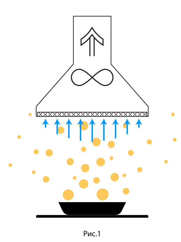 У допотопних витяжках для кухні повітряний потік має більшу швидкість по центру і меншу по краях, що призводить до часткового викиду пари в приміщення. У витяжці NETT 80% поверхня фільтра центром закрита склом. В результаті повітря, що всмоктується по периметру, рухається вгору зі швидкістю в п'ять разів більшою і створює повітряну завісу у формі коробки (рис 2.1). Зміна напрямку потоку на 90 градусів (рис 2.2) створює завихрення і за рахунок відцентрових сил повітря максимально очищається від крапель жирів і води.