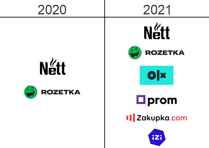 - За 2021 рік товари Nett стали доступні для покупки на таких маркетплейсах, як Rozetka.ua;Epicentr.ua;Prom.ua;OLX.ua;Zakupka.ua;Izi.ua и др.(см.8)