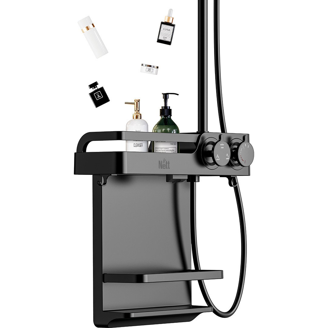 Душова система має у своїй конструкції вбудовані гачки, щоб можна було зручно повісити мочалку, скребок для скла і т.д.