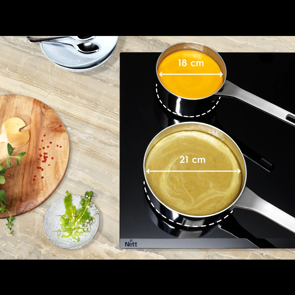 Магнітне поле взаємодіє на дно посуду і проводить струми індукції, залишає поверхню прохолодною, а каструлі і сковорідки миттєво нагріваються.Тепер немає проблем з великим розміром посуду. Варильна панель автоматично адаптується під розмір посуду і рівномірно розподіляє потоки енергії.