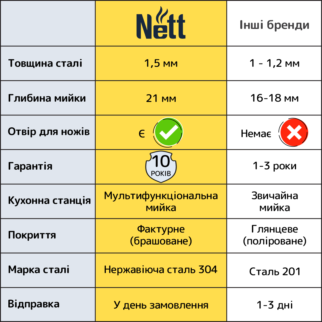 Сталь тільки найвищої якості 304 марки, ні в якому разі не 201 марки !!! На початку, візуально вони дуже схожі, але сталь 201 марки має в своєму складі меншу кількість нікелю і хрому. Як результат при тривалому використанні мийка починає іржавіти і протікати.
