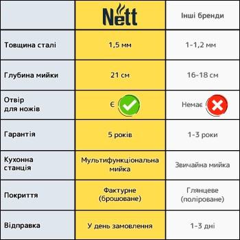 Унікальна особливість нашої мийки – вбудовані отвори для ножів. Тепер вам не доведеться купувати окремі підставки та піклуватися про чистоту вашої робочої поверхні.