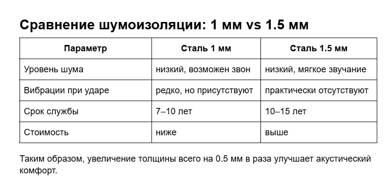 Одним из факторов, определяющих уровень шума, является толщина стали: чаще всего это 1 мм или 1.5 мм. На первый взгляд разница кажется незначительной, но на практике она ощутима. Разберёмся, почему.