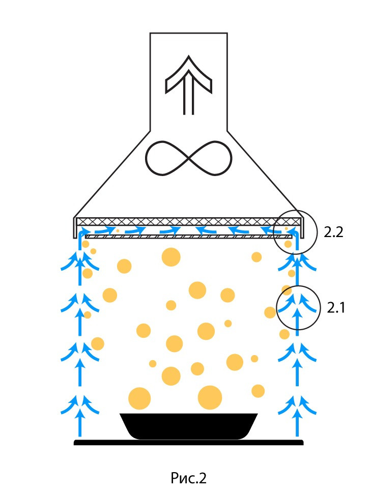 В допотопных вытяжках для кухни, воздушный поток имеет большую скорость по центру и меньшую по краям, что приводит к частичному выбросу паров в помещение. В вытяжке NETT 80% поверхность фильтра по центру закрыта стеклом. В результате всасываемый по периметру воздух движется вверх со скоростью в пять раз большей и создает воздушную завесу в форме коробки (рис 2.1). Пары не могут проникнуть сквозь эту завесу и все попадают на фильтр.Изменение направления потока на 90 градусов (рис 2.2) создаёт завихрения и за счет центробежных сил воздух максимально очищается от капелек жиров и воды.