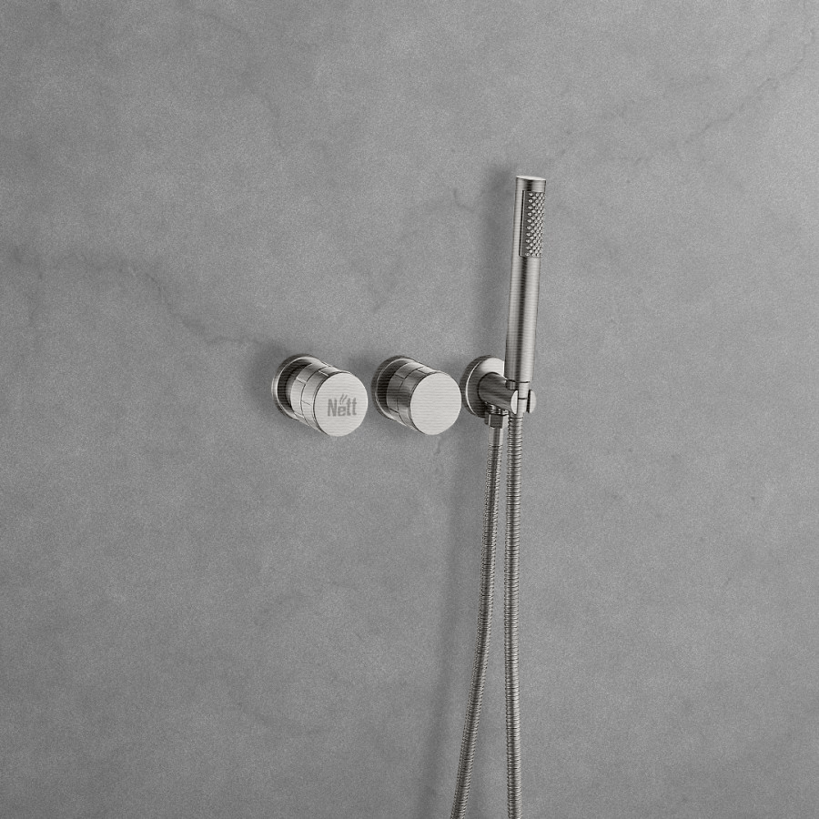 Душевая система Nett в оттенке никель выглядит дорого и аккуратно, отлично сочетается с серой плиткой, светлыми интерьерами и современной сантехникой. Это универсальный цвет, который придаёт пространству премиальный вид и остаётся актуальным вне трендов.