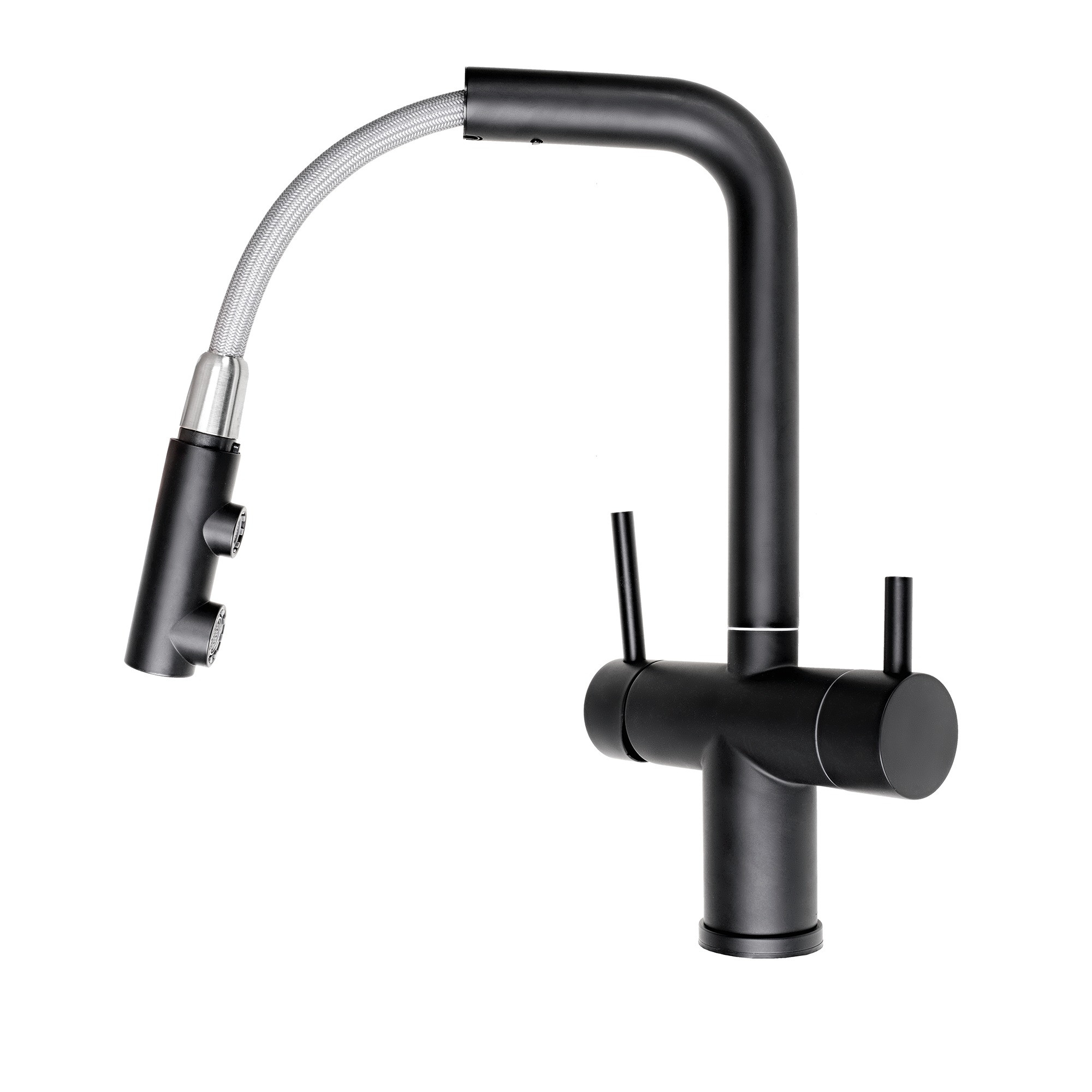 Этот тип смесителя разработан для подключения к как фильтрованной, так и непрофильтрованной воде. Он оборудован двумя рычагами для контроля подачи воды: левый для фильтрованной и правый для смешанной горячей и холодной воды.
