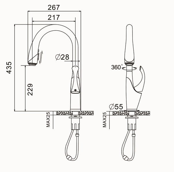 Кран для кухни имеет выдвижной распылитель, который беспрепятственно возвращается в исходное положение, стыкуясь плавно и уверенно. Гравитационная система расположена внутри носика, надёжно фиксирует распылитель на место.