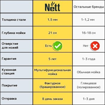 Сталь только самого высокого качества 304 марки, ни в коем случае не 201 марки!!! Вначале, визуально они очень похожи,но сталь 201 марки имеет в своем составе меньшее кол-во никеля и хрома. Как результат при длительном использовании мойка начинает ржаветь и протекать.